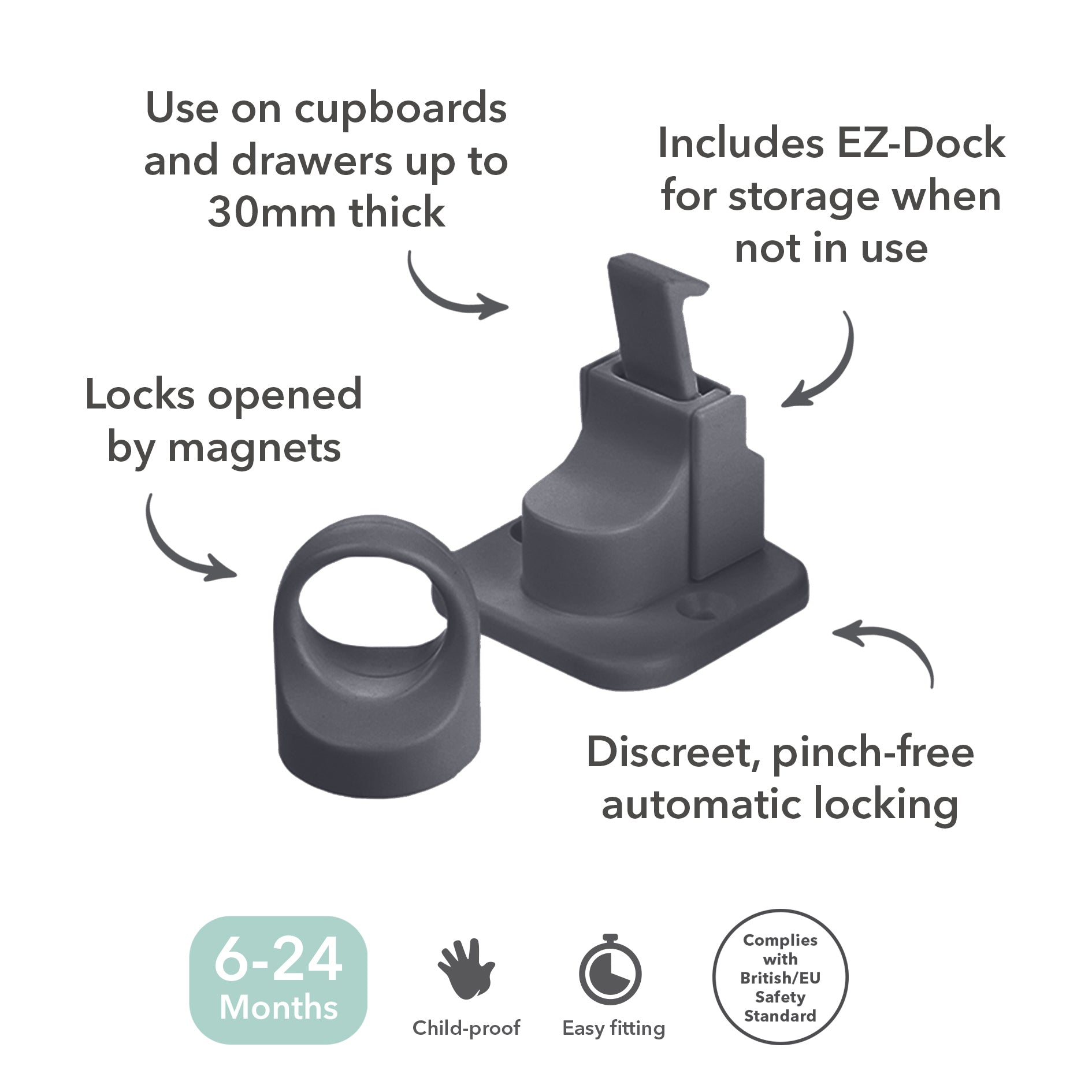 The Invisible Magnet Lock does not have any visible parts showing, keeping your home looking aesthetically pleasing all while your little ones safe. The unique EZ-Dock™ allows you to store the magnetic key safely out of reach of your little one when not in use.