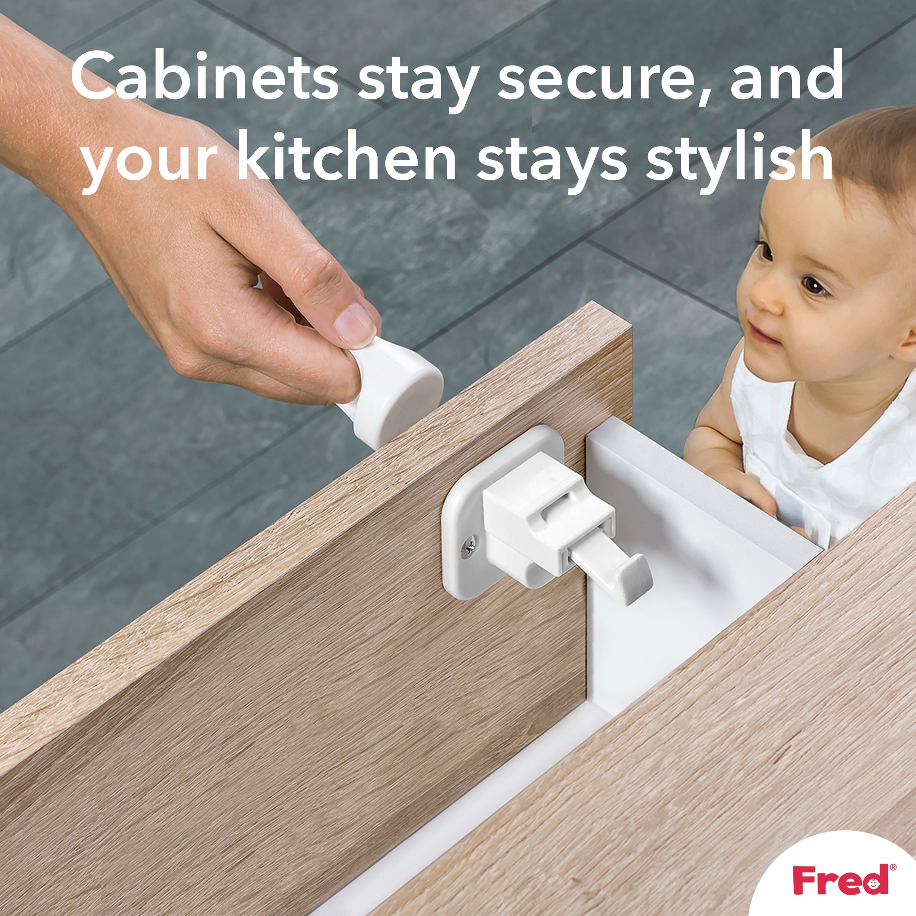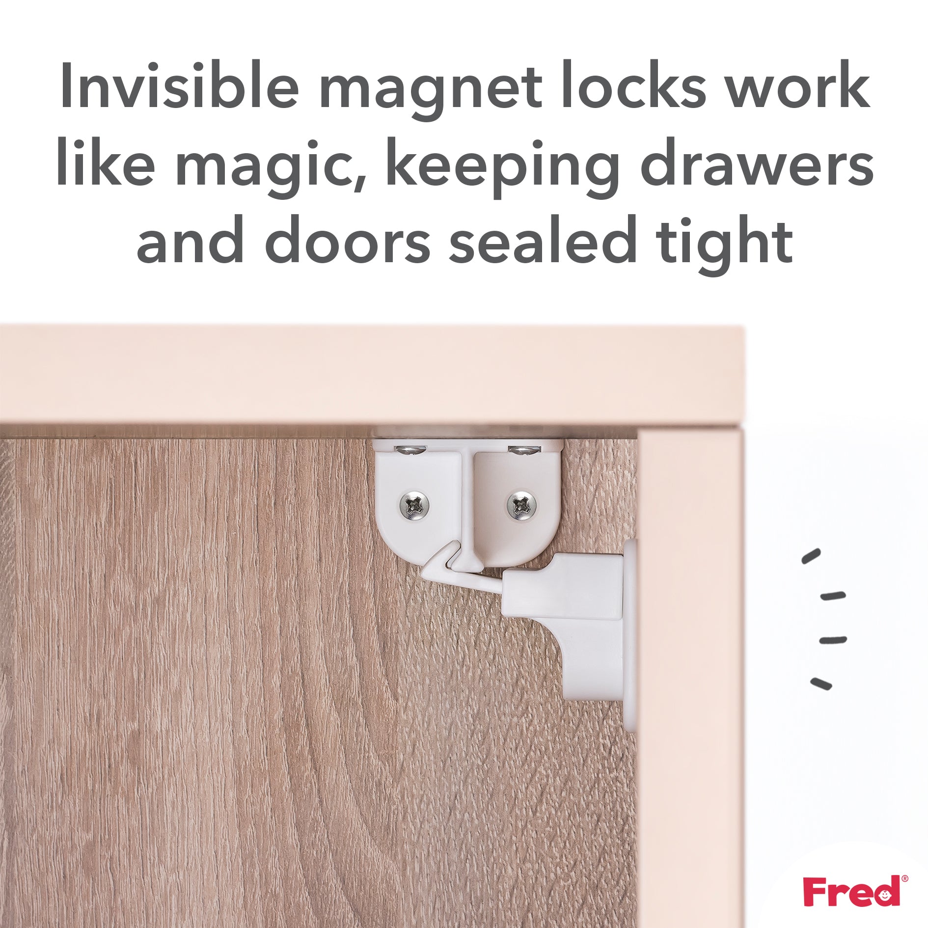Discreetly baby-proof cupboards and deeper drawers with locks opened by magnets. A hidden, child-proof magnetic lock, the Fred magnetic key works through doors and drawers (max. 30mm thick). Includes adhesive EZ-Dock™ to store the key safely out of reach of children.