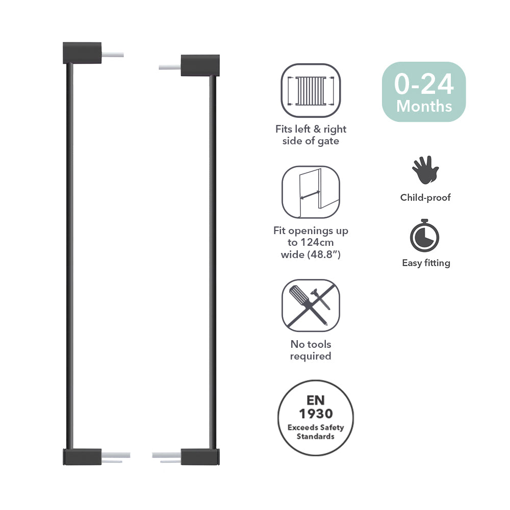 Each extension extends the gate by 7cm (2.8”). No tools are required for installation, simply push into position. Use maximum of 3 extensions either side of gate to protect openings up to 124cm (48.8”) wide.