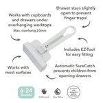 The SecureCatch™ stops children from opening the drawer wide enough to allow access and is made from bite and choke-safe non-toxic plastic. If your little one does happen to open the drawer, this mechanism ensures that the drawer will not snap shut again to avoid any potential finger injuries.
