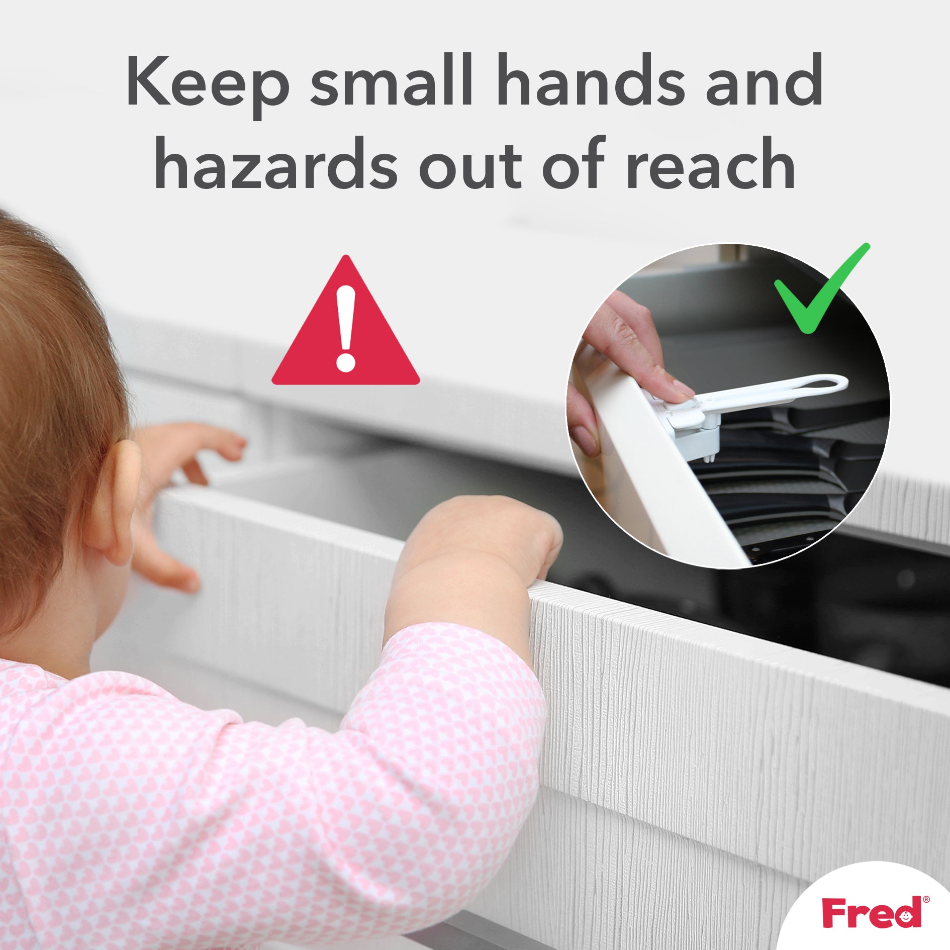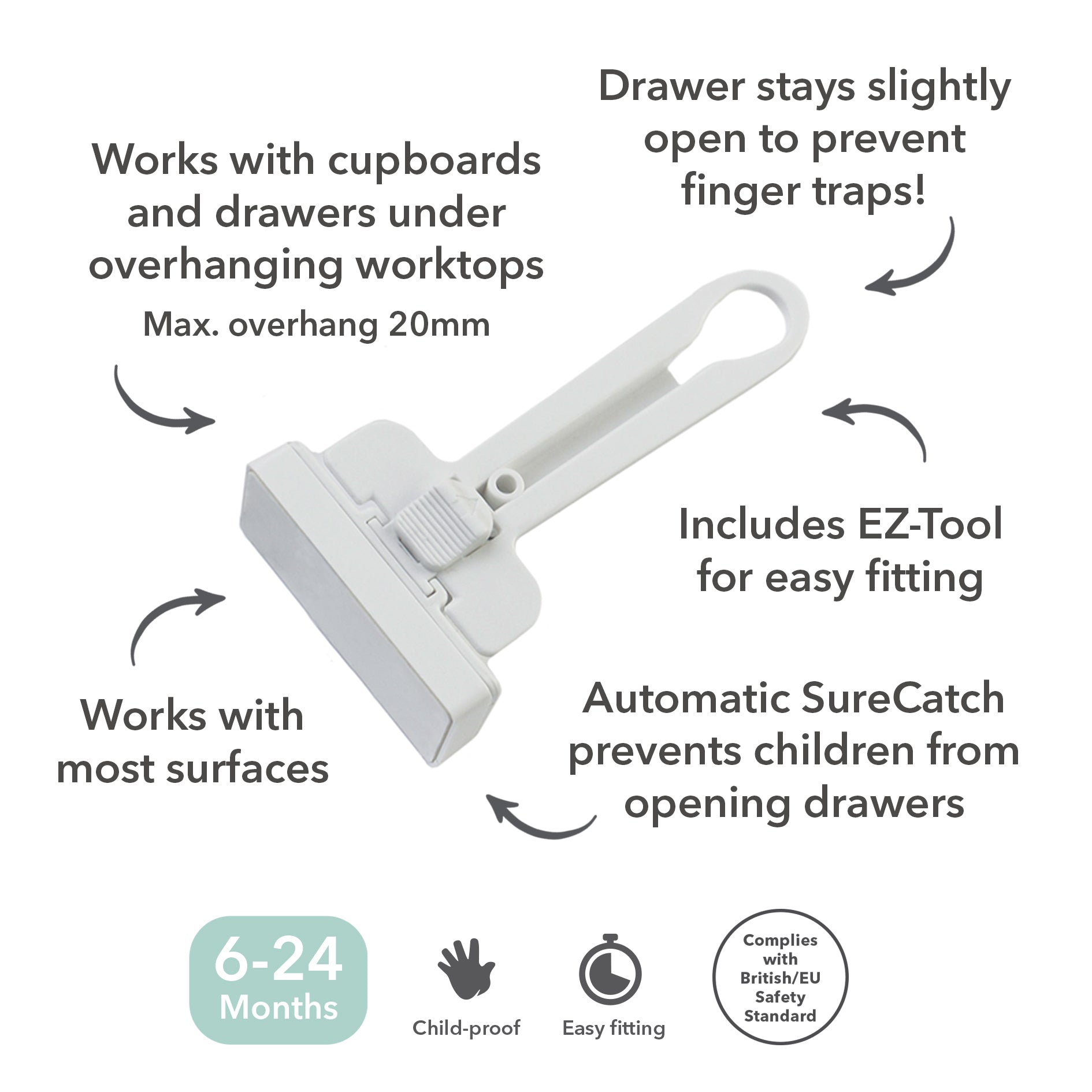 Keep small hands safe and hazards out of reach. The Fred Safety Top Drawer Catch is ideal for top drawers and cupboards where there is an overhanging work surface (max. 20mm). The automatic SureCatch™ stops children from opening the drawer wide enough to allow access.